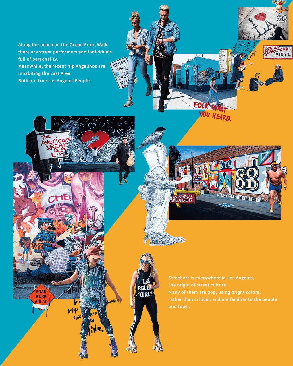 Los Angeles is the center of the West Coast and the leader of its unique relaxed atmosphere. Skateboards, surfing, movies, etc. have a powerful influence naturally spreading around the world. From the root of her organic culture, Los Angeles has been creating an evolved culture that often runs counter to what is considered common sense.