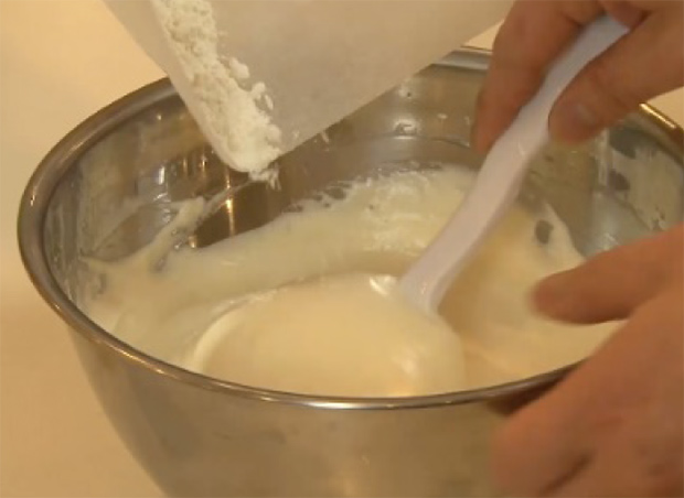 ふるっておいた薄力粉を表面全体に散らしながら少しづつ入れ、ボウルをまわしつつゴムベラで切るように混ぜる。
