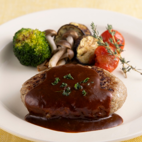 | 6. | ハンバーグと付け合わせをお皿に取り出す。フライパンの油を軽くふき取ったところへAの材料を入れてとろみが出てくるまで加熱する。塩コショウで味を整えてハンバーグにかける。ミニトマトを付け合わせの横に飾る。 |