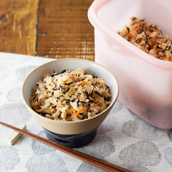 材料を入れてレンジでチンするだけで、栄養たっぷりの炊き込みごはんのできあがり。 後片付けも簡単です。