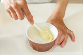 卵黄、豆乳、生クリーム、はちみつ、バニラオイルをボウルに入れ、よく混ぜてザルで漉して計量カップに移す。 | ![]() |