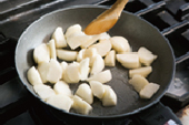 | 2. | tvsSOLIDAチタンコートフライパンに太白胡麻油、1を入れ、塩をふって火にかけ、しんなりするまで弱火で焼く。 | ![]() |