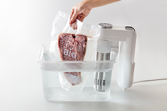 低温調理器を活用して、アウトドアやバルコニーでのお食事などにも最適なレシピです。加熱後袋のまま冷凍庫で保存、召し上がる前に解凍しあとは焼き付けだけるだけで、大きなお肉も美味しく調理でき、ふるまうことができます。
