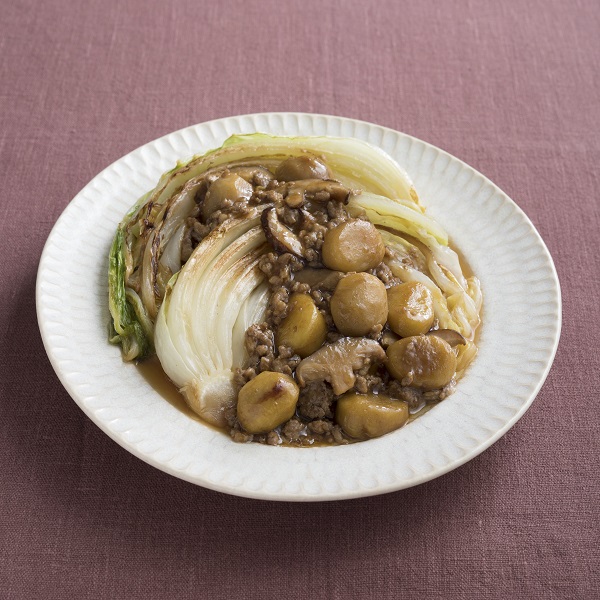 | 3. | フライパンにサラダ油を弱火で熱し、白菜と栗を入れる。白菜は断面を片面5分ずつ加熱し、アメ色の焼き色をつける。栗は適宜上下を返しながら焼き色をつけるように焼く。 |