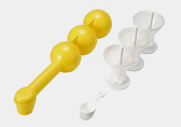 セットの内容は、材料を混ぜる串団子状のシェイカー、計量スプーン、材料を固める時に使うカップとその底ブタ、押し棒の5点です。