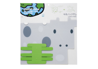 貝印株式会社では、切り開いた牛乳パックを乾かせるスタンド式の牛乳パック干しと、開いた牛乳パックを隠せる牛の形をした可愛らしいシートまな板がセットになった「牛乳パック干し(スタンド式)」を商品化、「mottai nice(モッタイナイス)」シリーズの1つとして今春より全国の大手量販店、専門店、通販等を通じて発売しています。