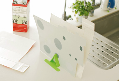 牛乳パックの再利用として、肉や魚の下ごしらえや、にんにくなど臭いの強いものを使う時に、まな板に汚れや臭いが残らないよう、開いて乾燥させた牛乳パックをまな板に見立てて利用する人が増えていますが、乾燥させるためには、立てかけたり洗濯バサミで吊るしたりが必要で、あまり見栄えのいいものではありません。