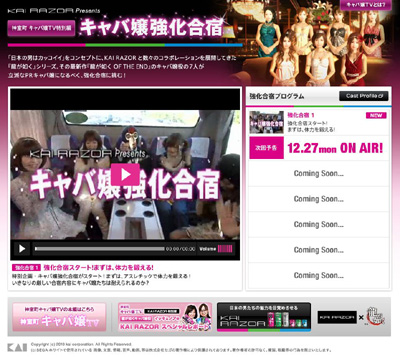 貝印株式会社では、男性用システムカミソリ「KAI RAZOR」シリーズ各製品で、大ヒット中のSEGA社の家庭用ゲーム「龍が如く」とのコラボレーションを今春から展開しています。今回その一環として、次回新作「龍が如く OF THE END」(2011年3月17日販売予定)に出演するキャバ嬢役7名の今後始まるゲームプロモーションにおける体力や団結力を養うための「キャバ嬢強化合宿」をサポートしました。その模様は、「神室町キャバ嬢TV」として12月20日より、「KAI RAZOR」専用ウェブサイト(http://www.kairazor.jp/)にて、随時公開していきます。