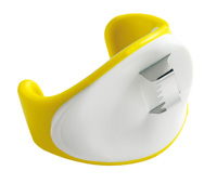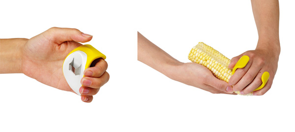 とうもろこしの粒を一度に2列はがせるカッターです。 本体は約7cmと小型で、手のひらに固定できるようになっています。刃体は、2列の粒をとらえるコの字型で、手にはめ込んだ本体をとうもろこしの芯に沿って動かすだけで、根本から綺麗に刈り取れます。 |
