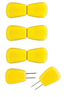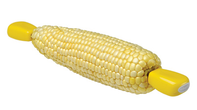 コーンをモチーフにした黄色のデザインで、先端に2本のピンが取り付けられており、本体の中心部は滑りにくいよう少しくぼませてあります。とうもろこしの両端に差し込むだけでピンがしっかり固定され、とうもろこしに直接触れることなくスマートに食べられます。保管時は、ピンを向い合せて2つの本体を並べることで、ピンが本体内に収納できるようになっています。
