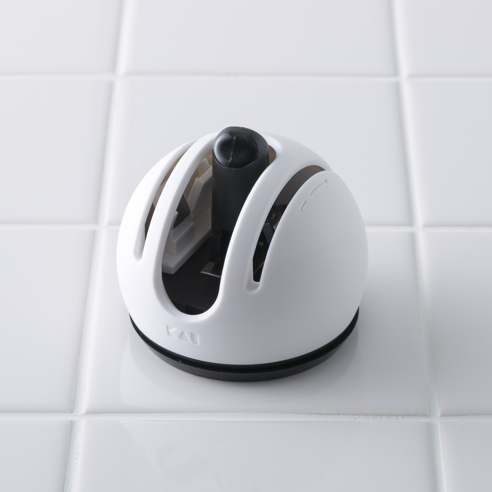 本商品は底面が吸盤式で、しっかりと固定でき、片手で容易に包丁研ぎができる、滑らかな半球の形状が特徴的なシャープナーです。研削力の高いダイヤモンド砥石(#400)で摩耗した刃先を削り取り、細かいダイヤモンド砥石(#1000)を使用し、刃先先端を滑らかに仕上げる2ステージ機能により、「切れ味の再現性」、「切れ味の向上」の両面に優れています。また、その“研ぎ”は、単に研いだ瞬間の切れ味の良さだけではなく、1本の包丁をより長く使うことを第一に考えてつくられています。根底には、800年の歴史をもつ日本最大の刃物の都、岐阜県関市の小さなポケットナイフ製造所に始まり、今年、創業105周年を迎える貝印が、刃物1つ1つを真心を込めて作り続けてきたことで培われた、刃物へのゆるぎない熱い思いがあります。