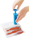ポンプを袋にセットし、上下させるだけで、簡単に袋から空気を抜いて、真空状態にすることができます。真空のまま保存することで、保存時に霜がつくことも防ぎます。