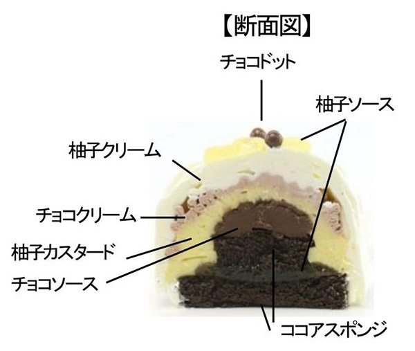 柚子ソースとチョコソースをココアスポンジに敷き、柚子カスタード・チョコクリーム・柚子クリームを重ねました。柚子の風味を豊かに感じられる爽やかな味わいのチョコレートモンブランです。