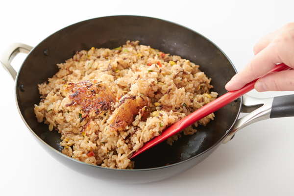 底面が2.3mmと厚めなので、ステーキ肉など厚みのあるお肉も焼き色を付けながらじっくりと焼き上げることができます。また、ハンドルにも耐熱樹脂を使用しているので、フライパンをそのままオーブンに入れて調理することも可能。IH調理器を含めたすべての熱源に対応しています。
