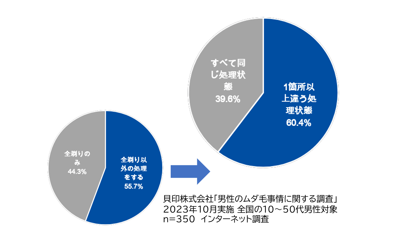 体毛処理経験がある男性の中で「全剃りだけ」の処理をしている割合は約44%、全剃り以外の処理をしている割合は約55%で、半数以上はカミソリでスキ機能のあるアイテムで処理する必要があり、男性のムダ毛処理においてスキ機能には一定の需要があることが分かりました。「全剃り以外の処理をする人」のうち約60%は、部位によって処理方法 (すく量であったり、部分的に毛を残す) を変えていることから、本製品は部位ごとに処理方法を変えたい場合にも、1本でお使いいただけるアイテムです。