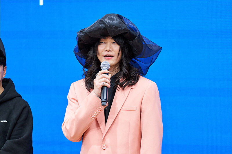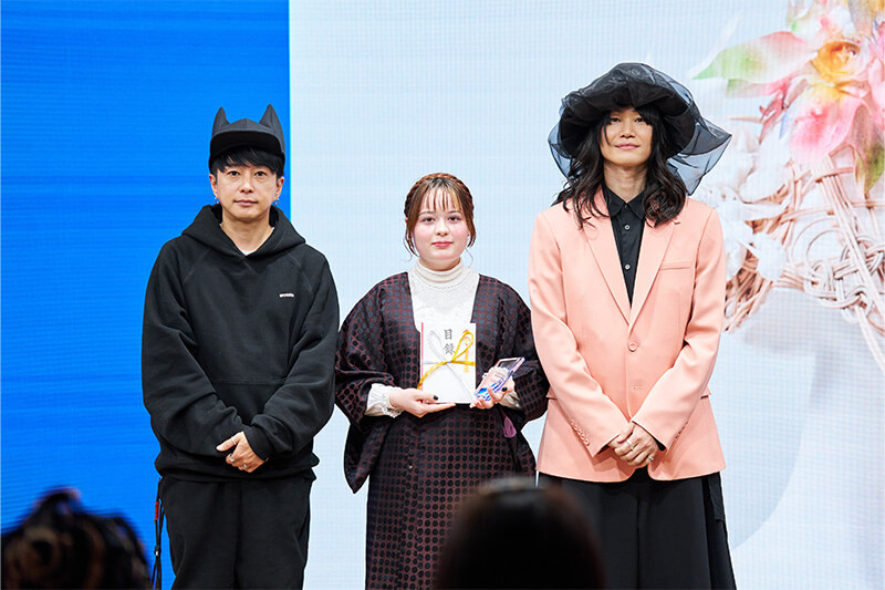 次に、最優秀賞の講評を田中さんと貝印鈴木よりいただき、田中さんは「見た瞬間から、テーマの『流動』の通り、まさに動いているようでした。360度どの角度から見ても美しく、流動感や力強さの中にも繊細な部分が見え、感動しました。これに合わせてお洋服を作りたくなりました。」とコメント。鈴木からは「『越境』というコンセプトを『流動』という作品に落とし込み、それがストーリーとしてしっかりしていました。実物を拝見した時、本当に具現化されており、努力と技術力を感じました。帽子なのかヘッドピースなのかという境界線さえも越境しており、今回のテーマを一番体現されていたと思います。」とコメントしました。