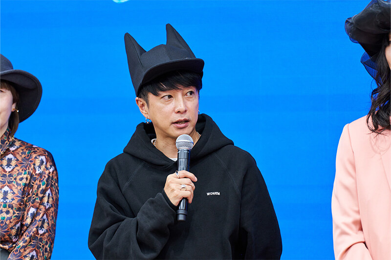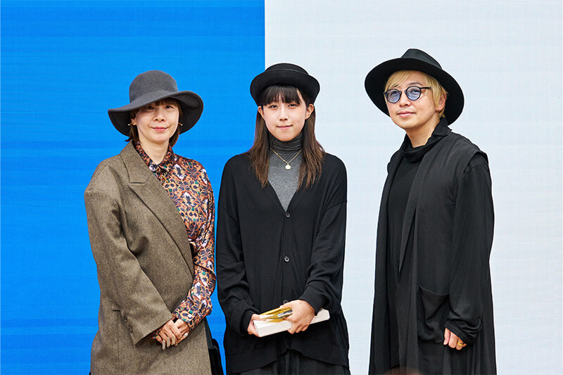 そして、こちらの審査員の方々に選んでいただけたことが今一番嬉しいです。」とコメント。審査員特別賞に選ばれたチェンシィーさんは、「私は学生で、課題をやりながらこの作品を作っていたので、形になるか不安でしたが、満足できる仕上がりになり、このような賞をもらえて嬉しいです。」とコメントしました。また、審査員の方々にも講評をいただきました。まず、審査員特別賞の講評を日爪さんと奈良さんよりいただき、日爪さんからは「課題と並行して制作されていたと聞き驚きました。完成度が高く、特にシェイプラインに惹かれました。ファーストインプレッションからこの作品だと感じました。」奈良さんからは「学生さんと聞いてびっくりしました。クオリティが高く、世界観が伝わる作品です。審査員の中でも皆が『良い』となって選ばれました。」とコメントいただきました。