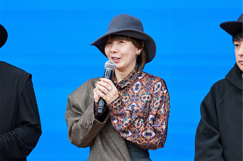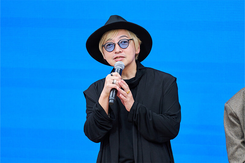はじめに、今年で117年を迎えた貝印グループについて説明し、お客様一人一人と対話し、大切に考えて、ものづくりする「野鍛冶の精神」を大切にしていると話しました。また、40年縫製ハサミを製造している貝印とHat & Head-piece Designerの日爪氏と共に開発した縫製ハサミ「O(オー)」についても話し、開発する過程で本コンテストの話が立ち上がり開催する運びとなったと伝えました。そして今年は、応募者数が昨年度比230%に伸び、14の国と地域からご応募いただいたこと、また今後も本コンテストが5年、10年と続いていくように尽力していき、皆様と一緒に、ファッション・帽子業界を盛り上げていきたいとお伝えしました。