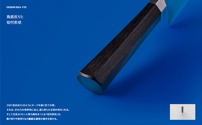 道具を作るのではなく、人が道具を使う瞬間/行為そのものを創ることを意識して、日々ものづくりを行っています。見た目の美しさだけではなく、その人が使いやすいような無駄のない「機能の美」、使う人の心を動かす形状や素材である「意匠の美」、そしてすでに成熟したこの刃物という業界の中においても、進化を諦めない「革新の美」の3つの美を取り入れてデザインをしています。