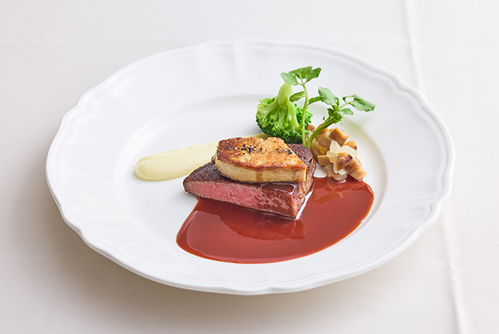 黒毛和牛モモ肉のポアレとフォアグラのロッシーニ仕立て トリュフ香るマデラソース クリスマス島の塩を添えて