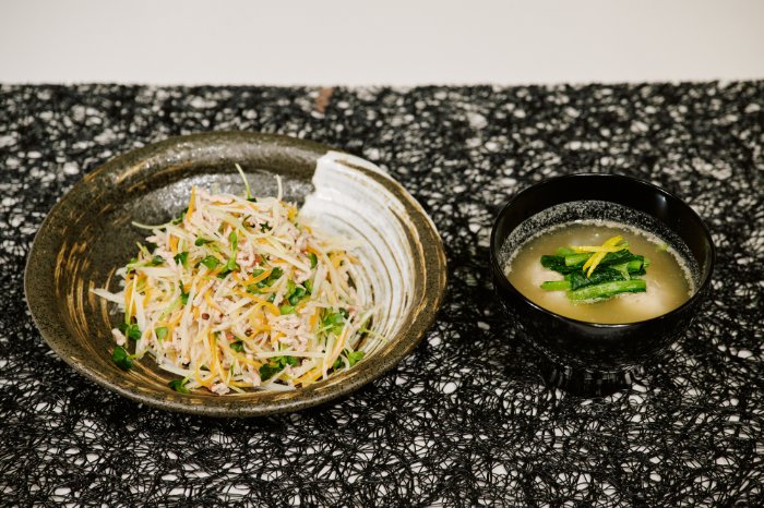 ⑤出汁パックの中身(1袋半)と貝割れ大根と和え、完成!【鶏つみれの胡麻汁】