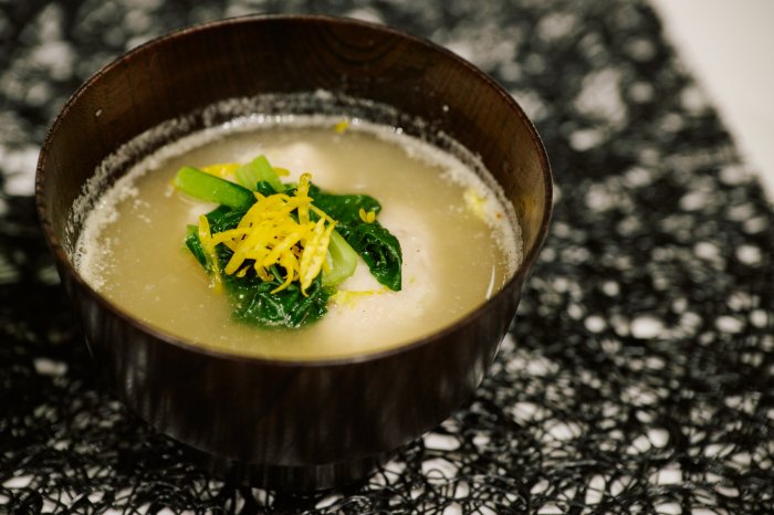 ④合わせた汁を温めて、つくねをスプーンで取り形を整え汁に投入し火を入れ、足りなければ味を整え、小松菜を入れ一煮立ちさせる。