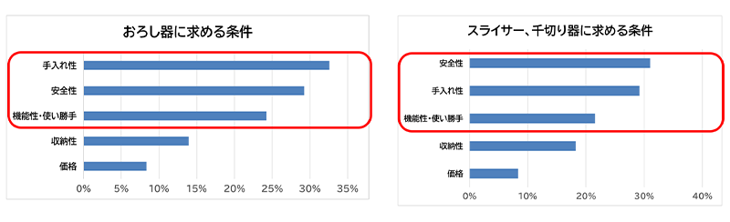 全国の20代から50代の男女を対象におろし器やスライサー、千切り器に求める条件の調査を行ったところ※3、安全性や機能性はもちろん、お手入れのしやすさを重視する声が大きいことが分かりました。