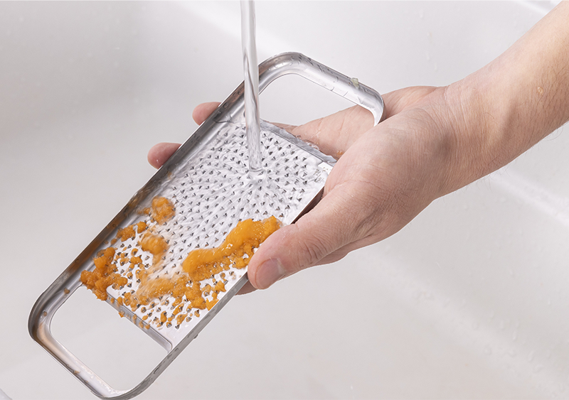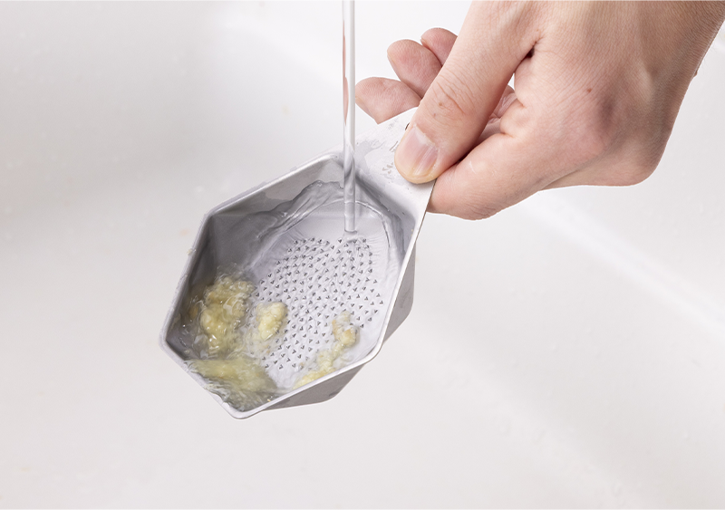 目立て形状と配置を工夫し、食材を軽い力でスムーズにおろせる設計。 - 食材が目詰まりしない新形状の目立て。流水だけで食材が綺麗に流れ落ちるため、ストレスフリー。