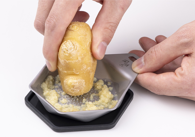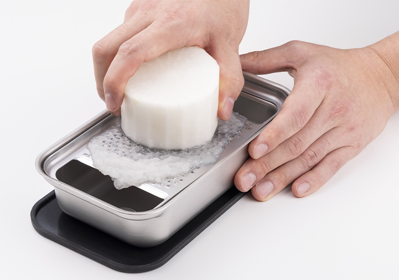 今回新しく発売した「関孫六 オールステンレス おろし器 極目立て(受け皿付き)」「関孫六 オールステンレス 薬味おろし 極目立て」は、目立ての形状と配置の工夫によって、おろしやすさと洗いやすさを両立させました。食材を軽い力でスムーズにおろせるだけでなく、使用後は水で洗い流すだけで食材を洗い落とすことができ、ストレスフリーでご使用できます。