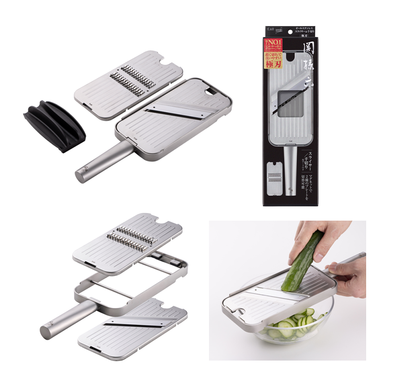 同時に発売する「関孫六 オールステンレス スライサー&千切り 極刃」は、貝印No.1※4の切れ味を誇るスライサーと、鋭い切れ味のクランク刃でスピーディーに調理できる千切りをセットにした商品です。プレートは取り外して丸洗いできるためお手入れがしやすく、さらに刃部を隠して収納できる設計を採用するなど、安全性にも配慮しています。