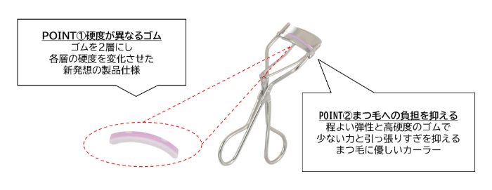 厚さの異なるやわらかゴムと硬めゴムの「2層構造ゴム」がまつげを優しくピタッと守る構造❶上側のやわらかゴムがまつげを優しくカール