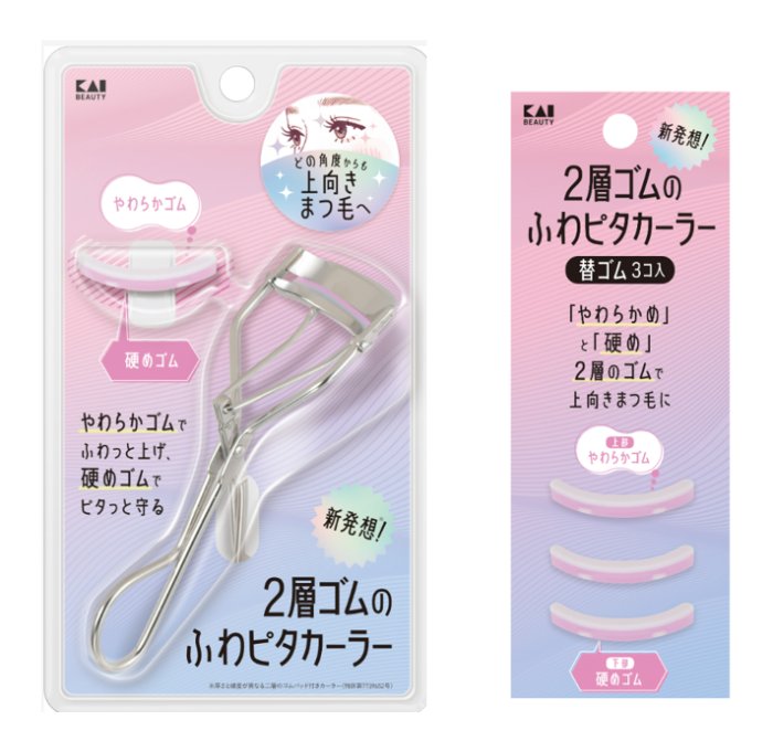 「2層ゴムのふわピタカーラー」は、替ゴムの硬度を2層にした新発想のカーラーです。厚さの異なるやわらかゴムと硬めゴムの「2層構造ゴム」がまつげを優しくピタッと守る構造で、特許を取得(特許第7739652号)しました。上側のやわらかゴムがまつげを優しくカール、下側の硬めゴムがストッパーとして機能し、力が入りすぎてプレートが沈み込むことを防止、滑らかで自然なカールに仕上げます。