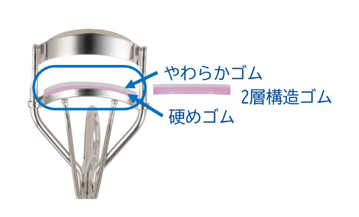 厚さの異なるやわらかゴムと硬めゴムの「2層構造ゴム」がまつげを優しくピタッと守る構造❶上側のやわらかゴムがまつげを優しくカール