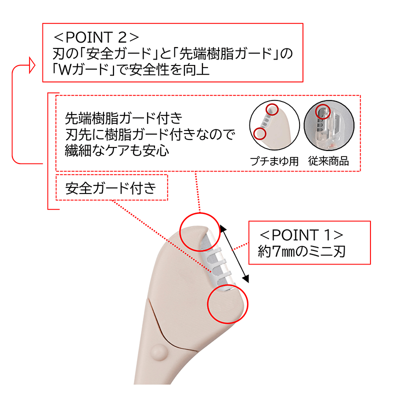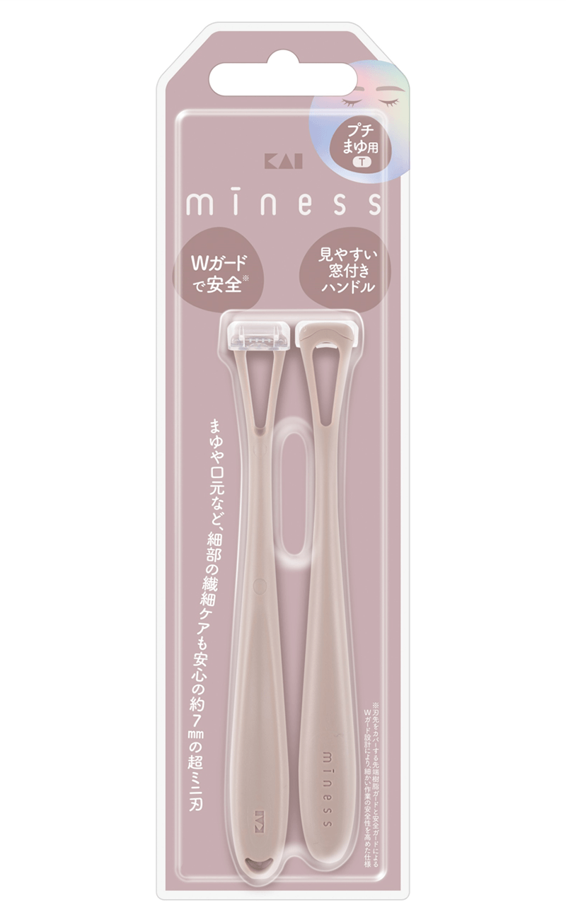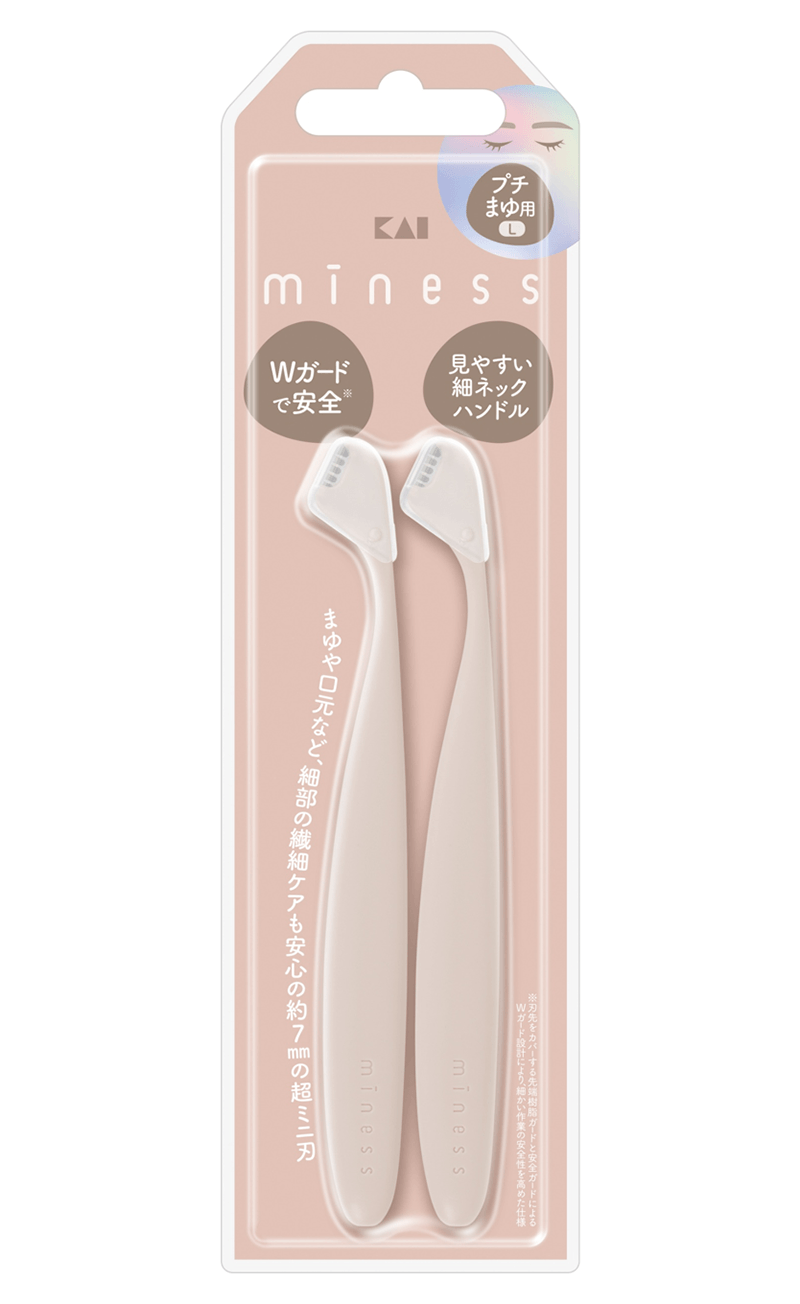 今回は新たに「プチまゆ用カミソリ」をL型、T型の2種類を発売いたします。貝印が10代から50代の女性を対象に実施した調査では、顔のうぶ毛処理において、眉は年齢問わずカミソリでの処理実施率が高く、なかでもminessのターゲット層である10~20代女性は平均以上の実施率であることが分かりました。また、一般的なまゆ用カミソリよりもさらに刃の短いカミソリへの関心も同様に高いことから、今回の「プチまゆ用カミソリ」の開発に至りました。細かいケアのしやすさにこだわった「プチまゆ用カミソリ」は、約7㎜の超ミニ刃とそる部位を見やすい形状のカミソリ。刃は先端樹脂ガードと安全ガードのWガード仕様とすることで安全性を向上させているため、まゆの仕上げなど繊細な細部のケアも安心です。