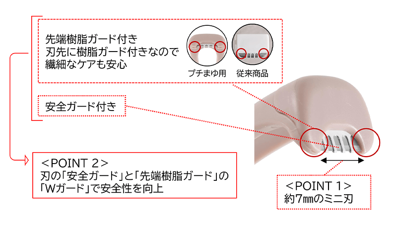- 先端樹脂ガード と 安全ガード のWガード刃で安全性を向上