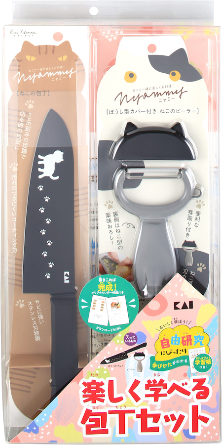人気のNyammyシリーズから、可愛らしいねこのイラストを載せた包丁と、ねこモチーフのピーラーをセット。