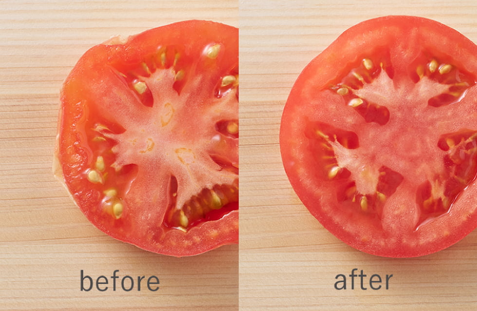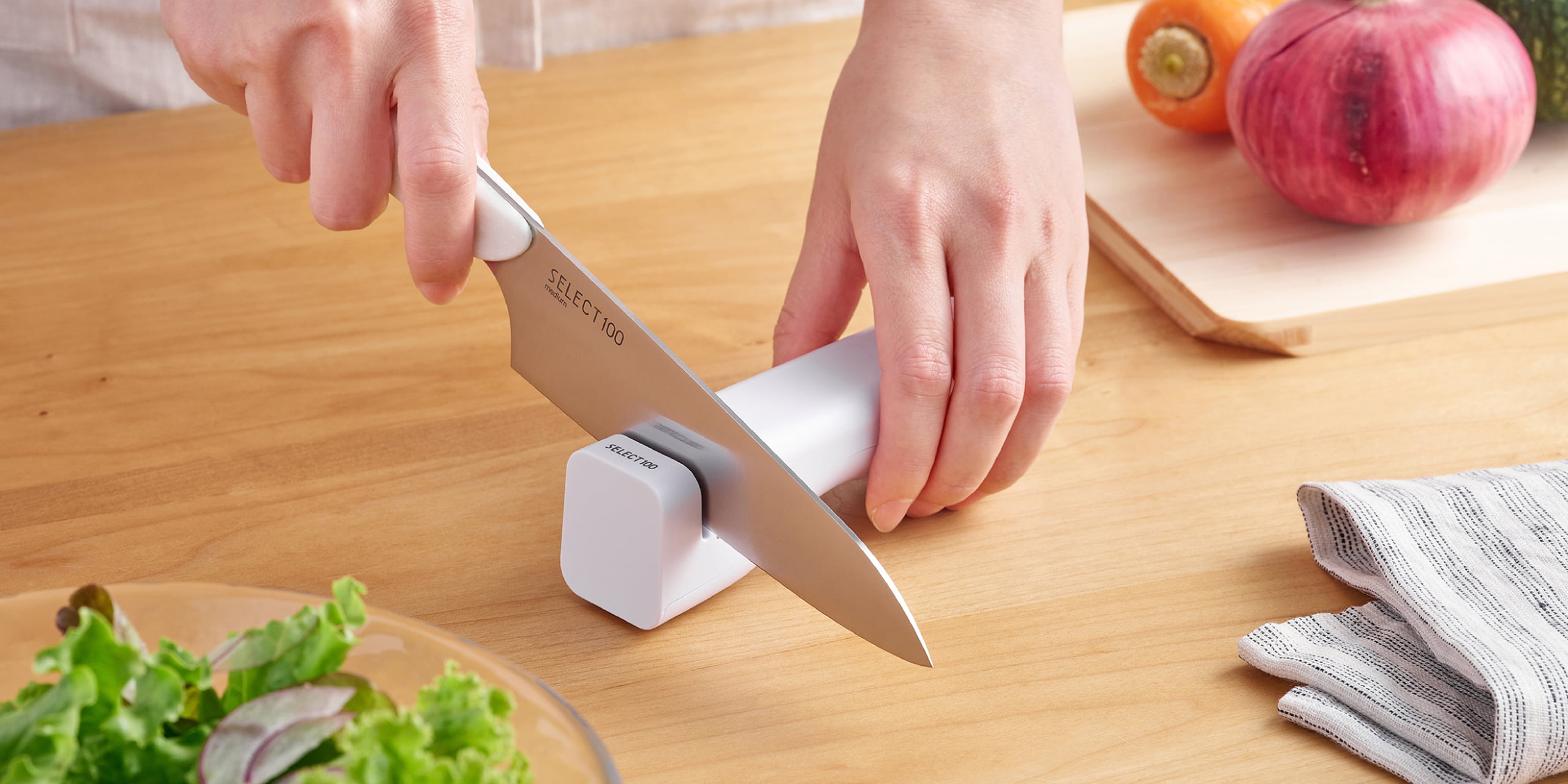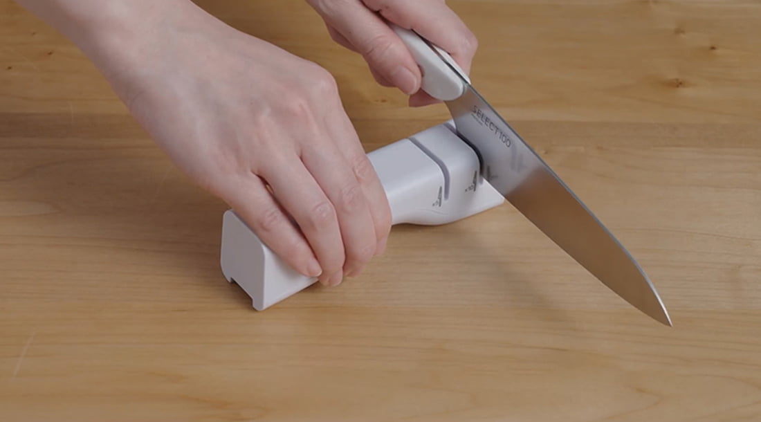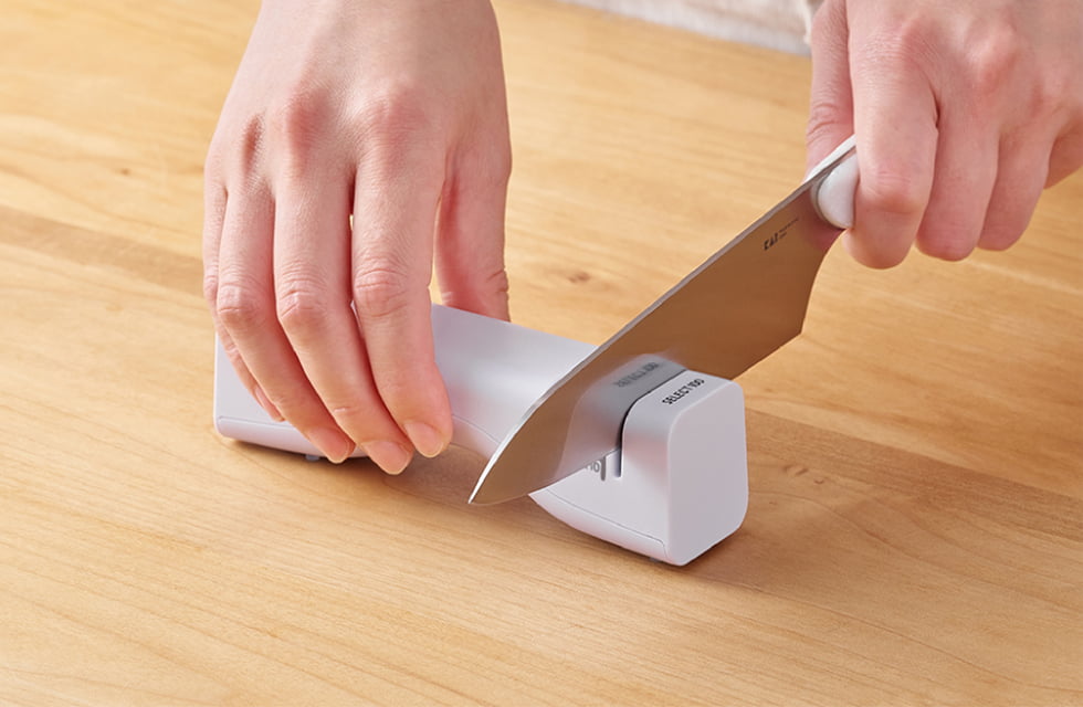 When you feel your knife is not sharp enough, such as when you can’t cut cleanly through a tomato or through chicken skin, just quickly sharpen it with this sharpener.