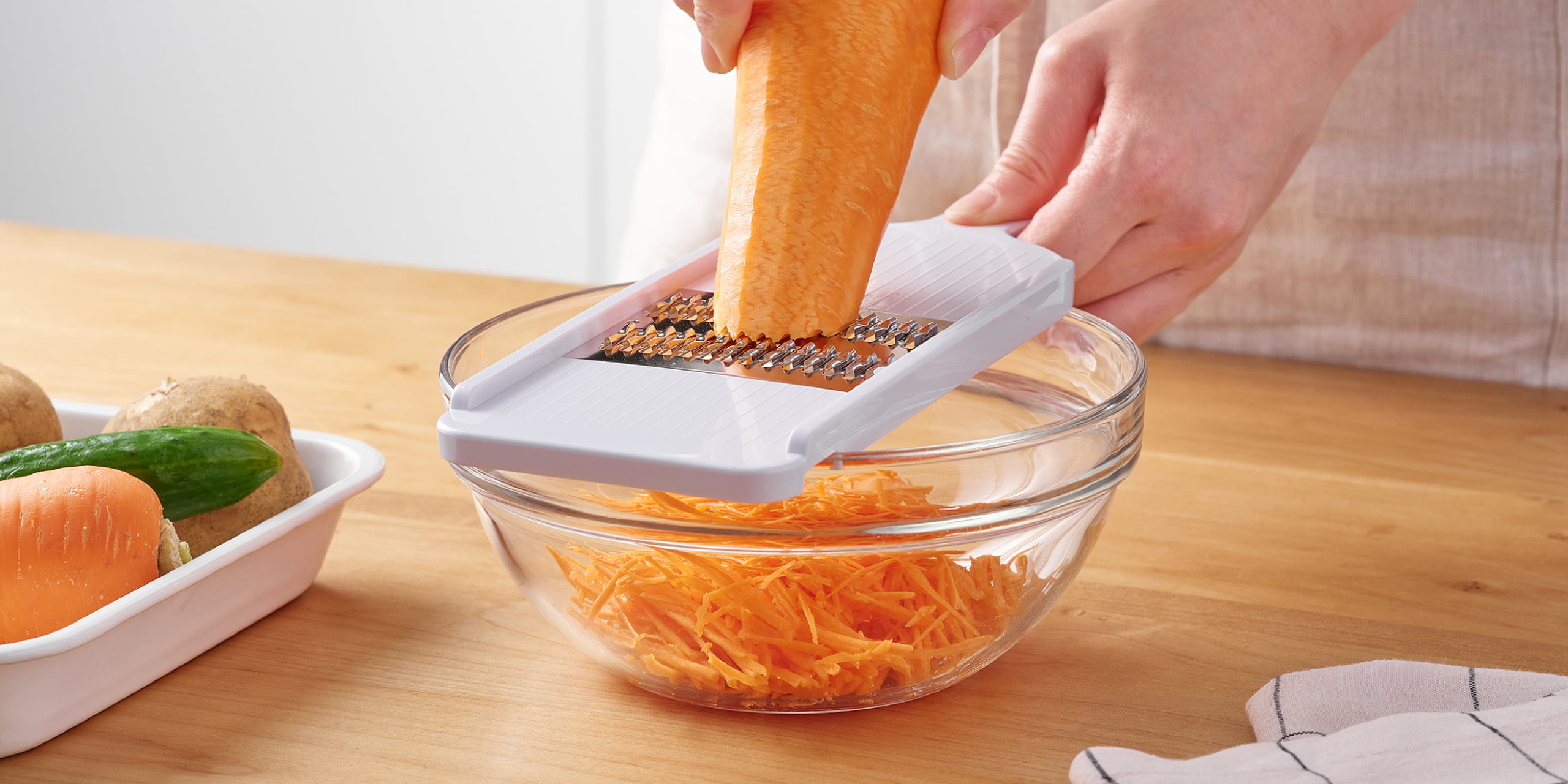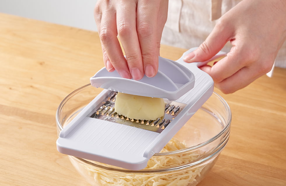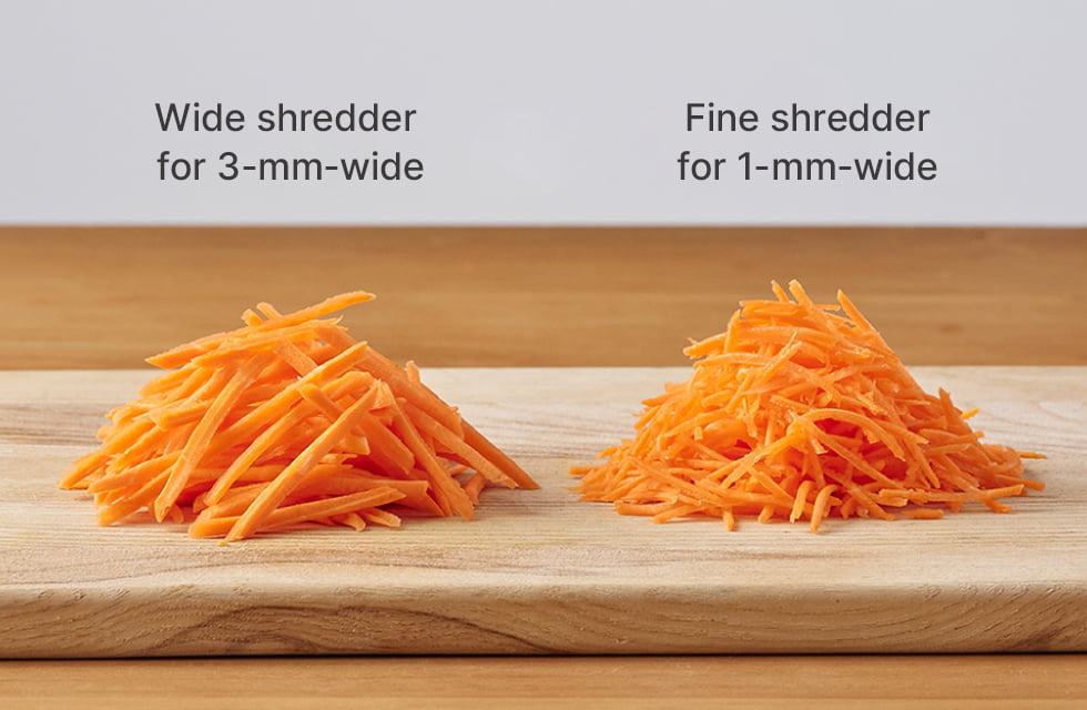 A wide shredder for 3-mm-wide, even more crisp strips and a fine shredder for 1-mm-wide strips to enjoy a delicate texture are also available.