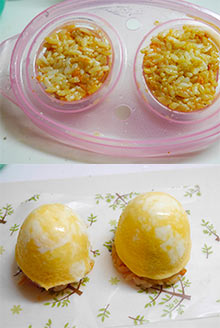 ②に塩を加え、<ミニオムライスメーカー>容器Aの線まで流し込み、容器Bをかぶせます。